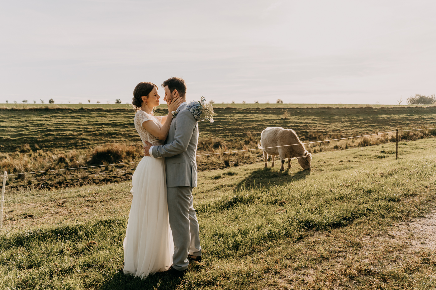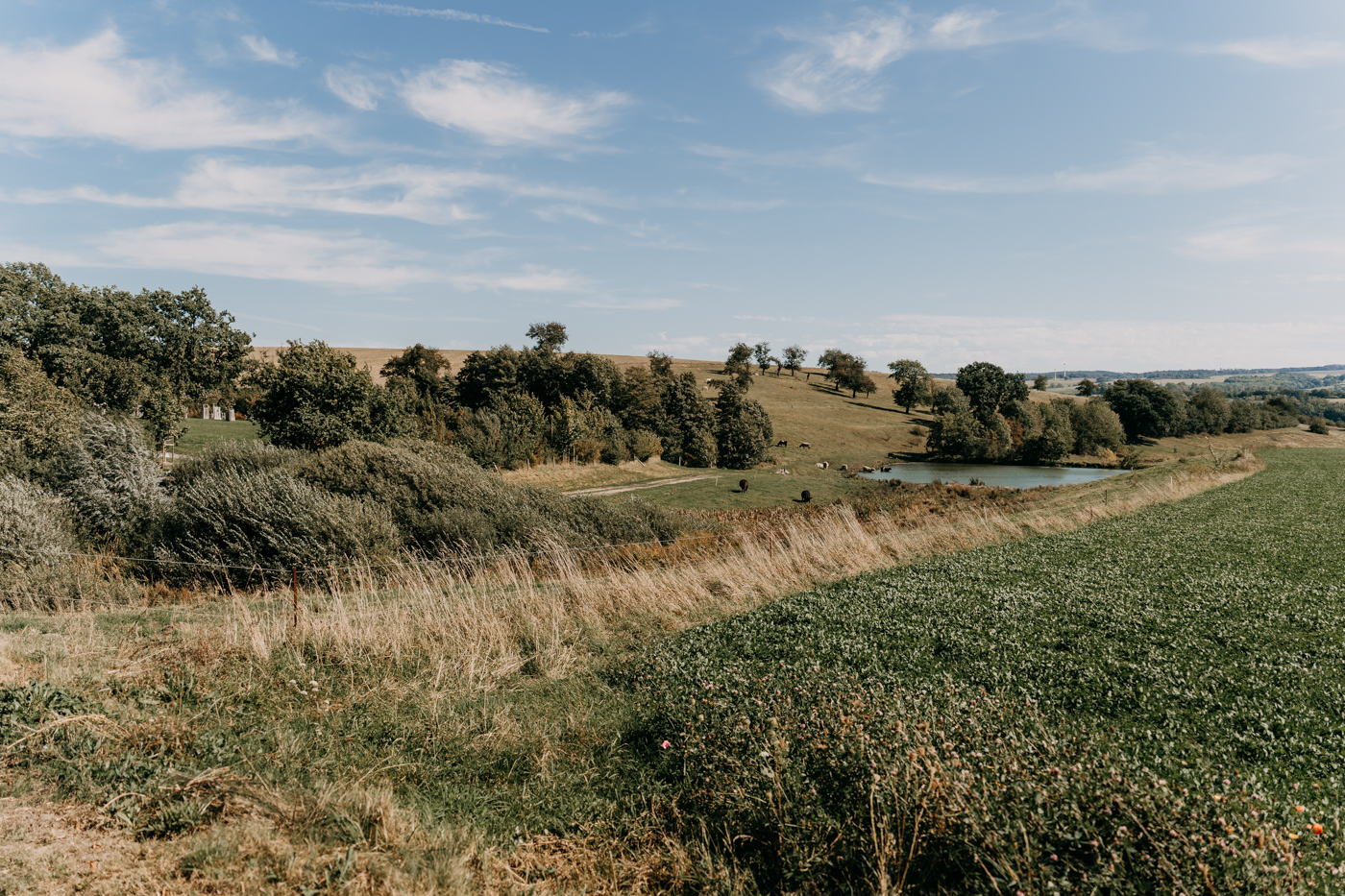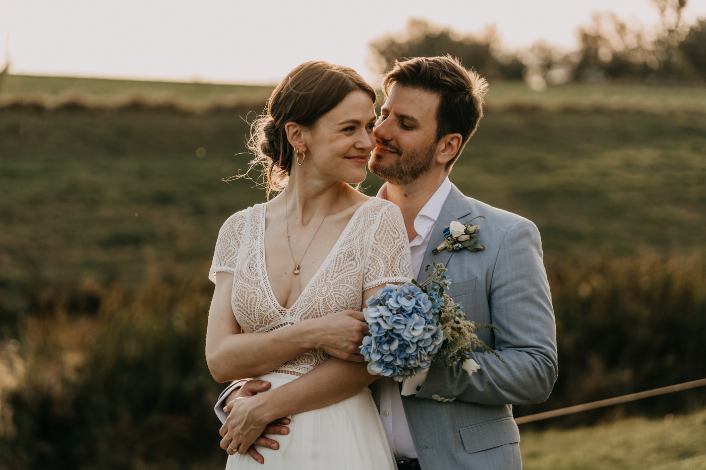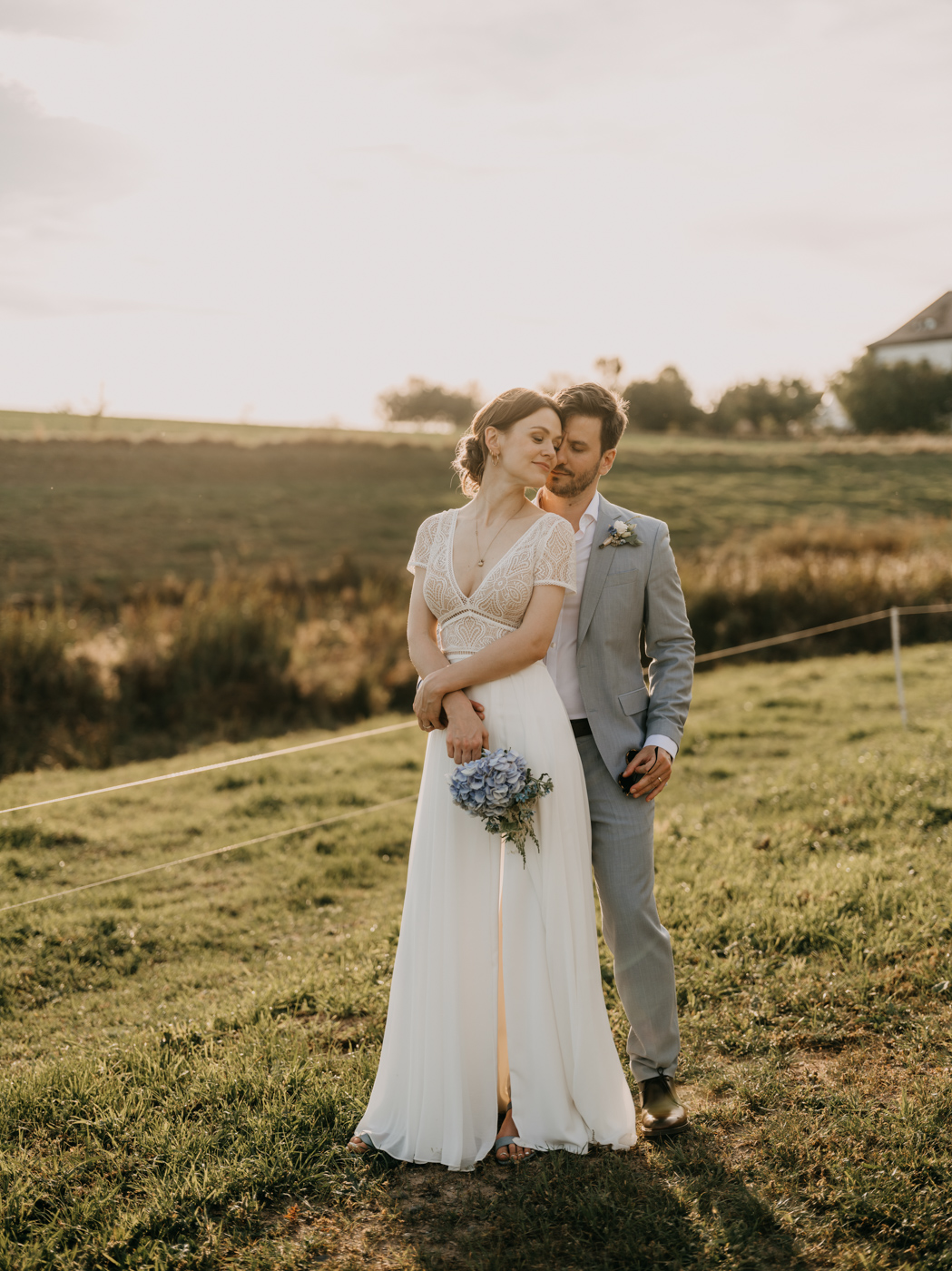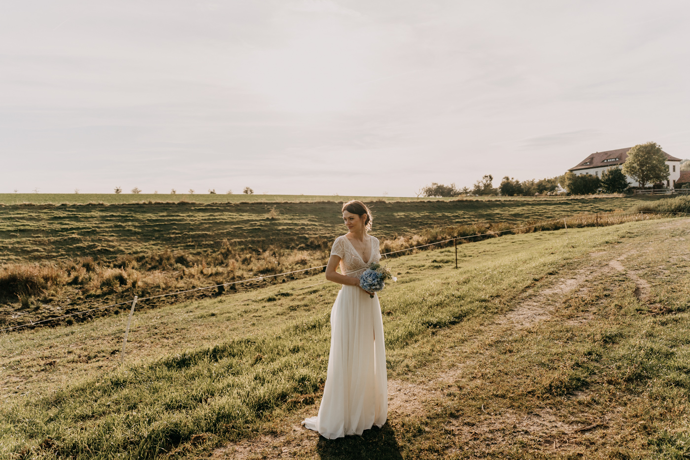 Natürlich durfte auch ein romantisches Paarshooting nicht fehlen. Rund um das Rittergut Positz gibt es unglaublich viel Natur – Wiesen, Felder und sogar Rinder, die neugierig zuschauten. Zwischen all dem entstanden entspannte, intime Bilder, die perfekt zu einer Land- und Scheunenhochzeit passen: natürlich, ruhig und voller Nähe.