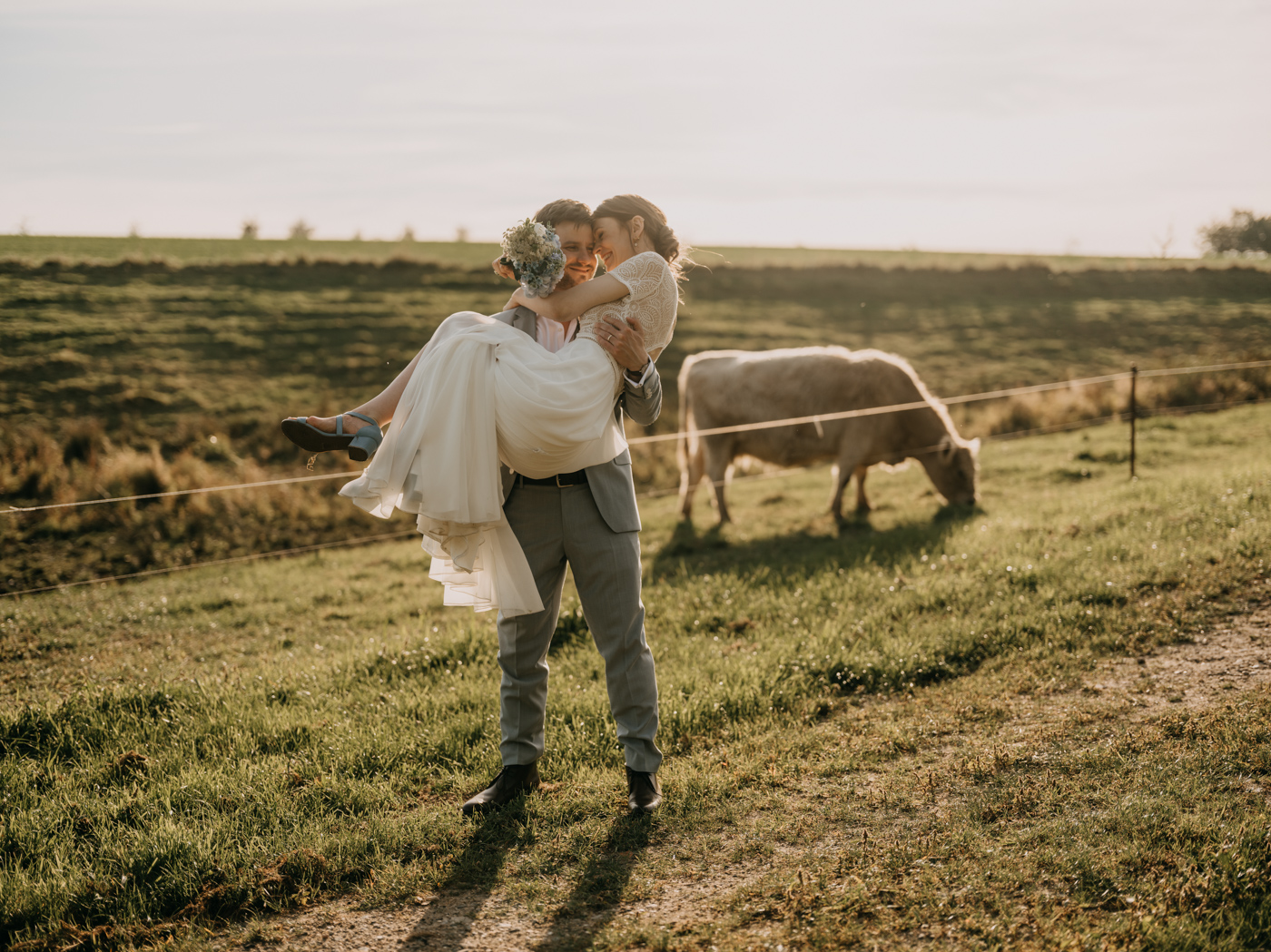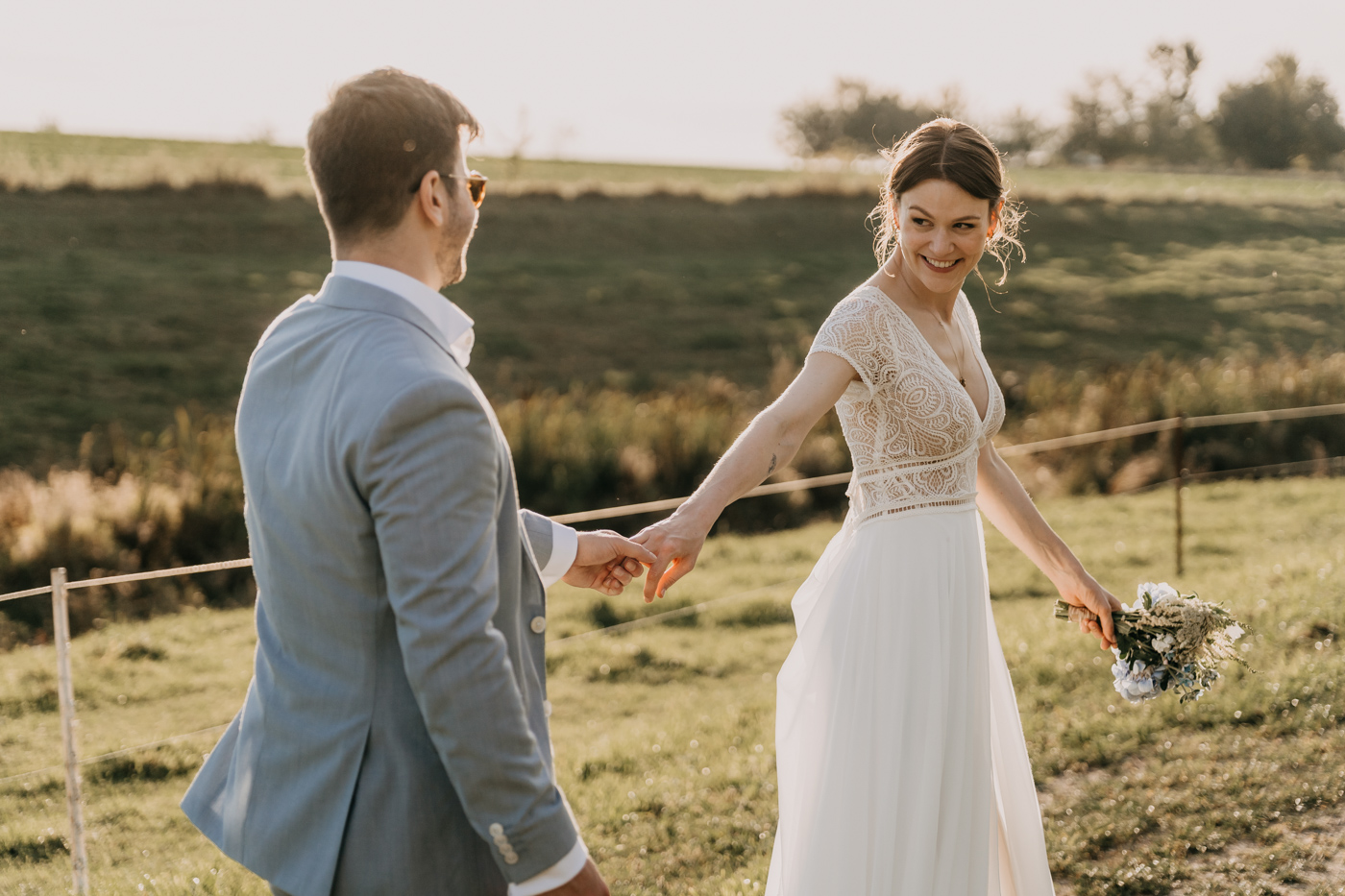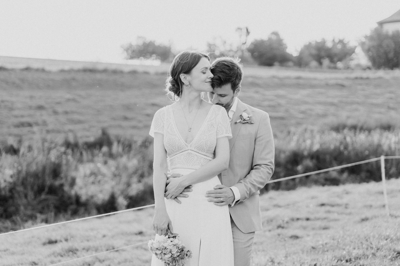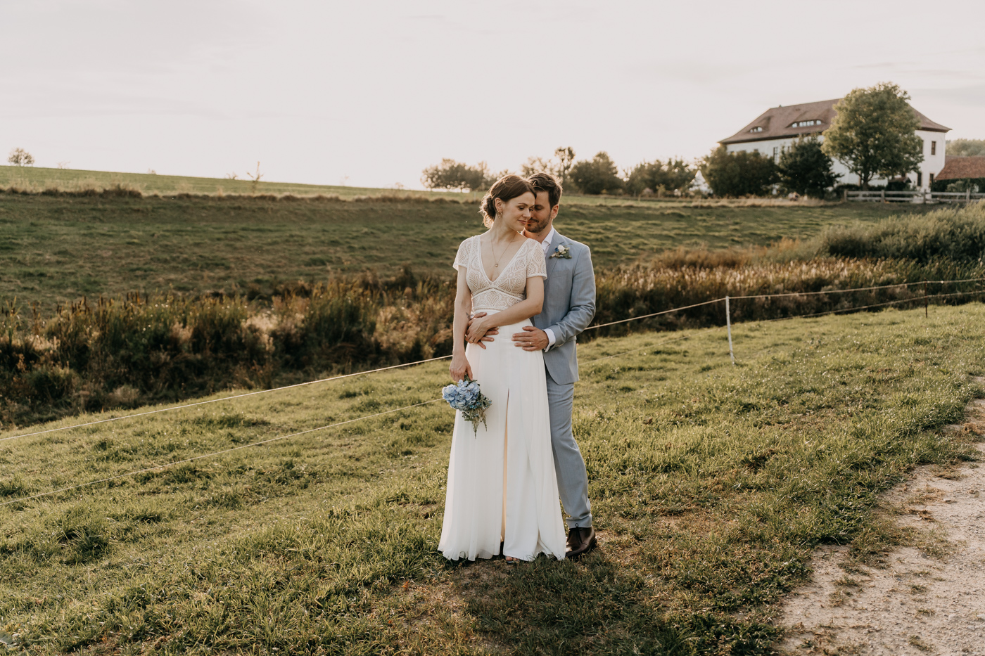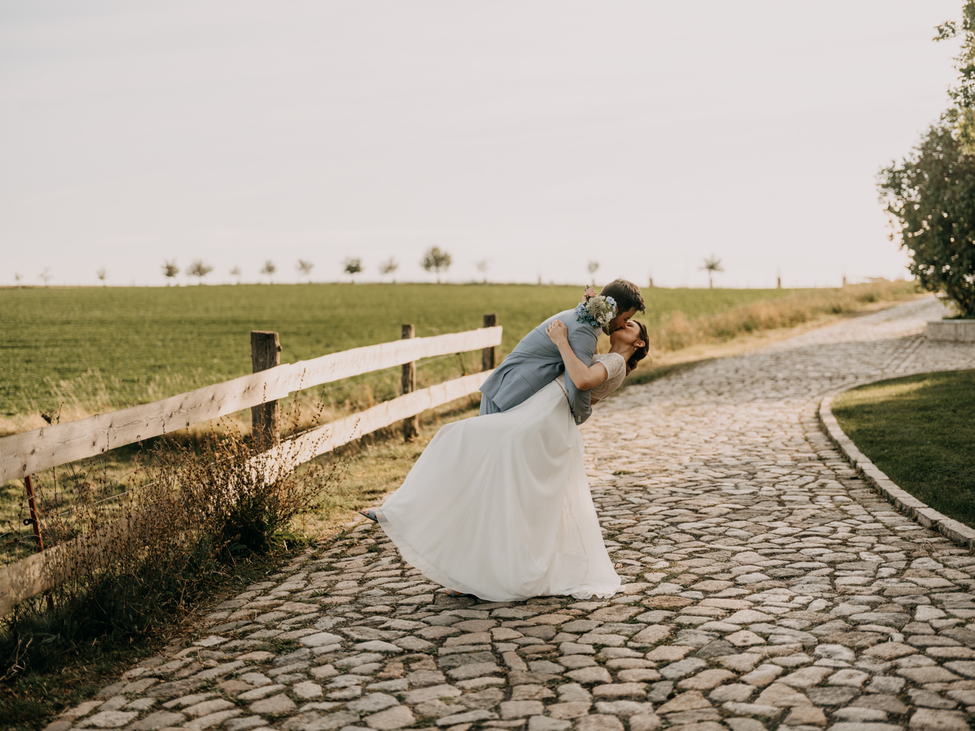 Natürlich durfte auch ein romantisches Paarshooting nicht fehlen. Rund um das Rittergut Positz gibt es unglaublich viel Natur – Wiesen, Felder und sogar Rinder, die neugierig zuschauten. Zwischen all dem entstanden entspannte, intime Bilder, die perfekt zu einer Land- und Scheunenhochzeit passen: natürlich, ruhig und voller Nähe.