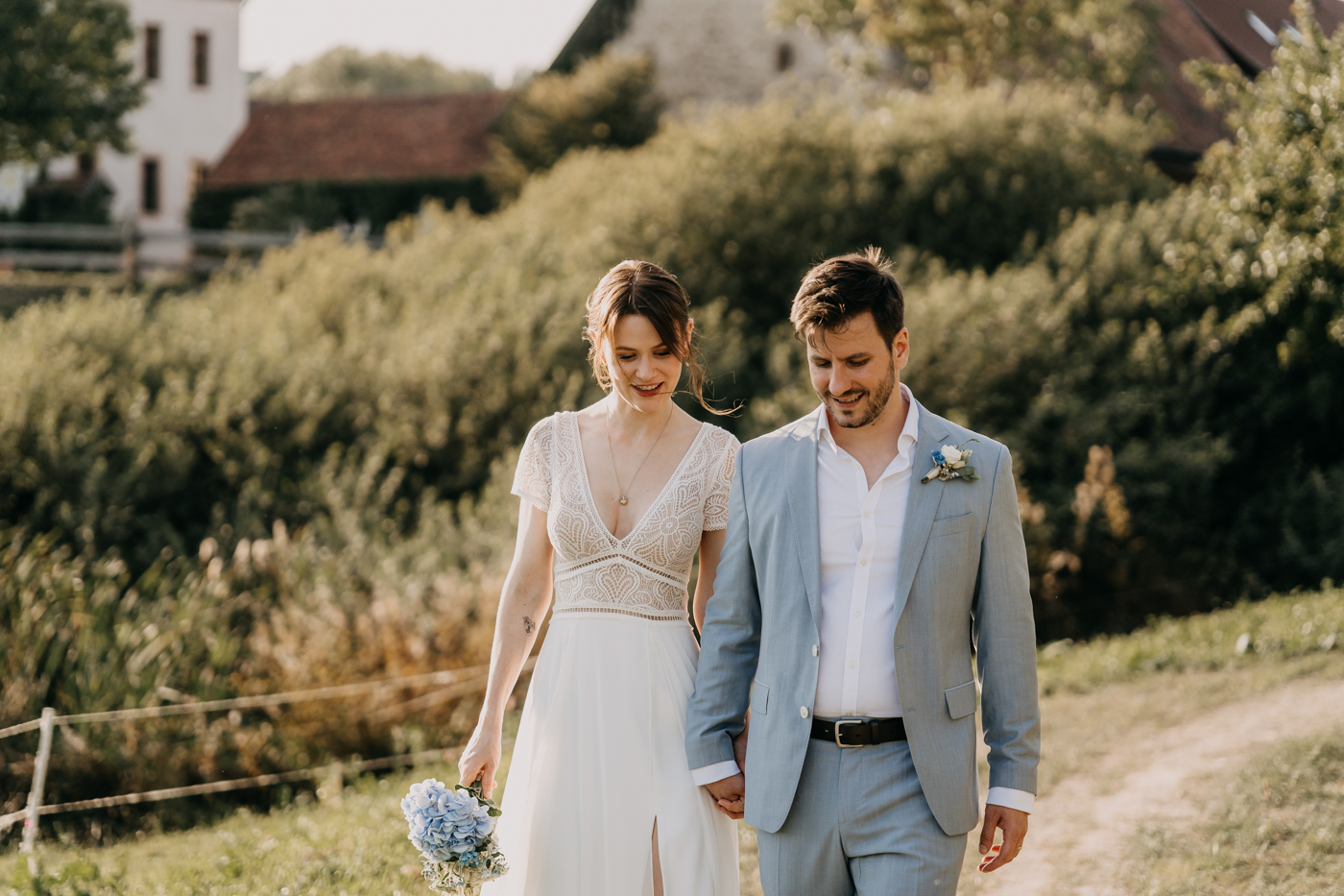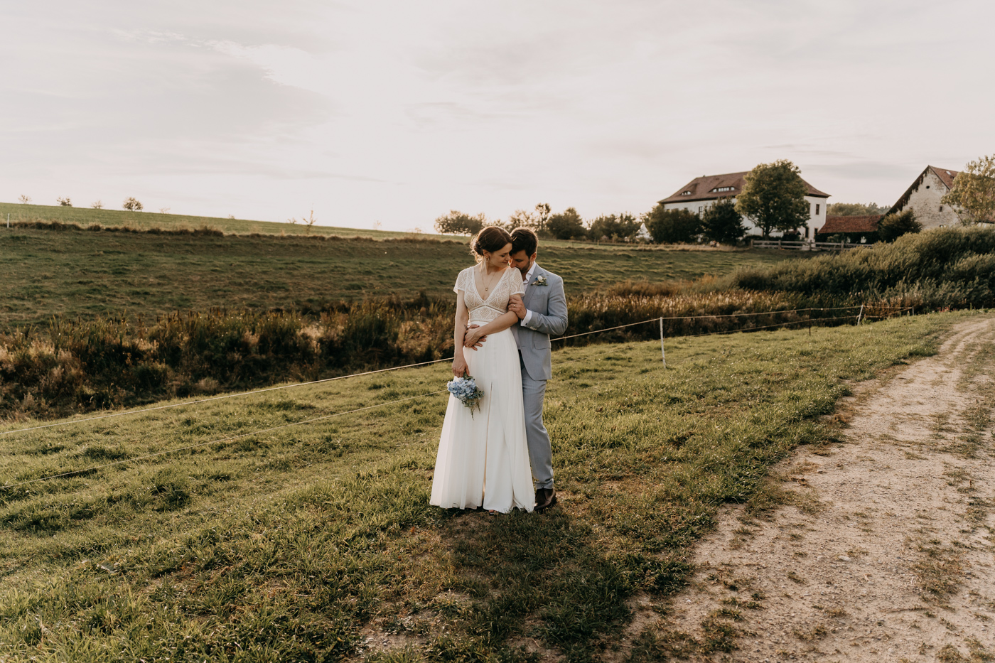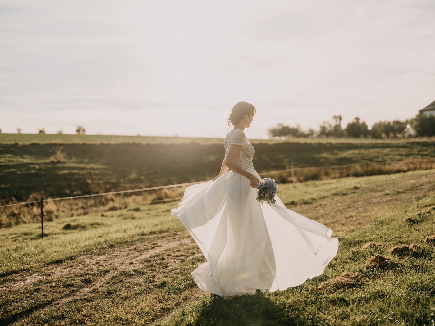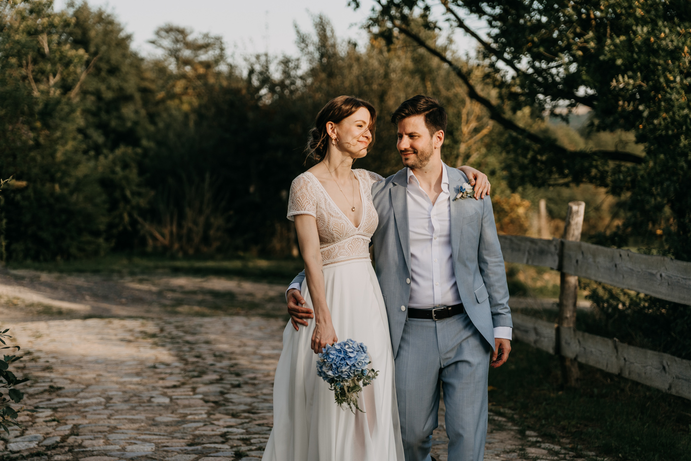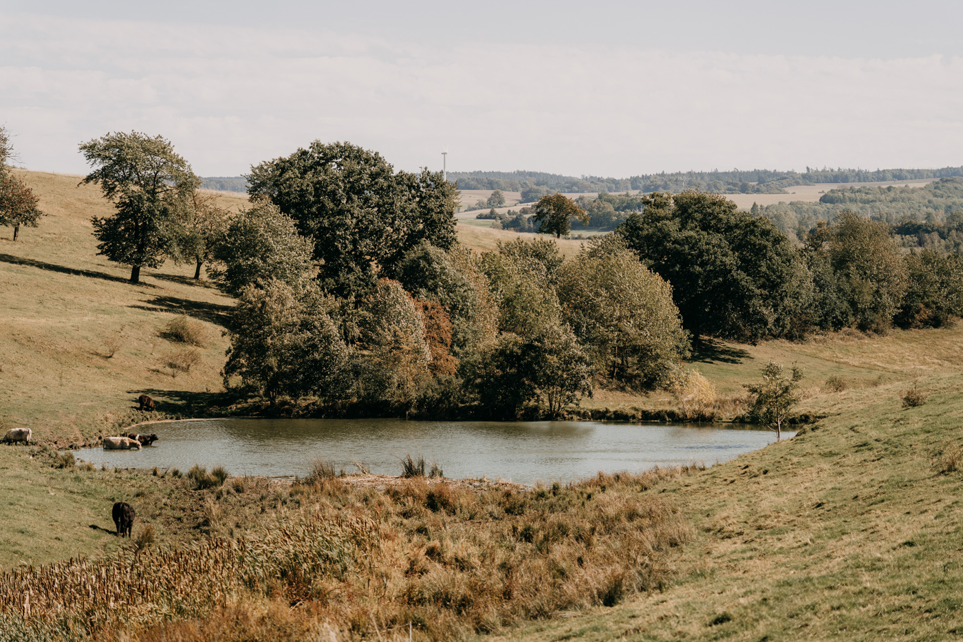 Natürlich durfte auch ein romantisches Paarshooting nicht fehlen. Rund um das Rittergut Positz gibt es unglaublich viel Natur – Wiesen, Felder und sogar Rinder, die neugierig zuschauten. Zwischen all dem entstanden entspannte, intime Bilder, die perfekt zu einer Land- und Scheunenhochzeit passen: natürlich, ruhig und voller Nähe.
