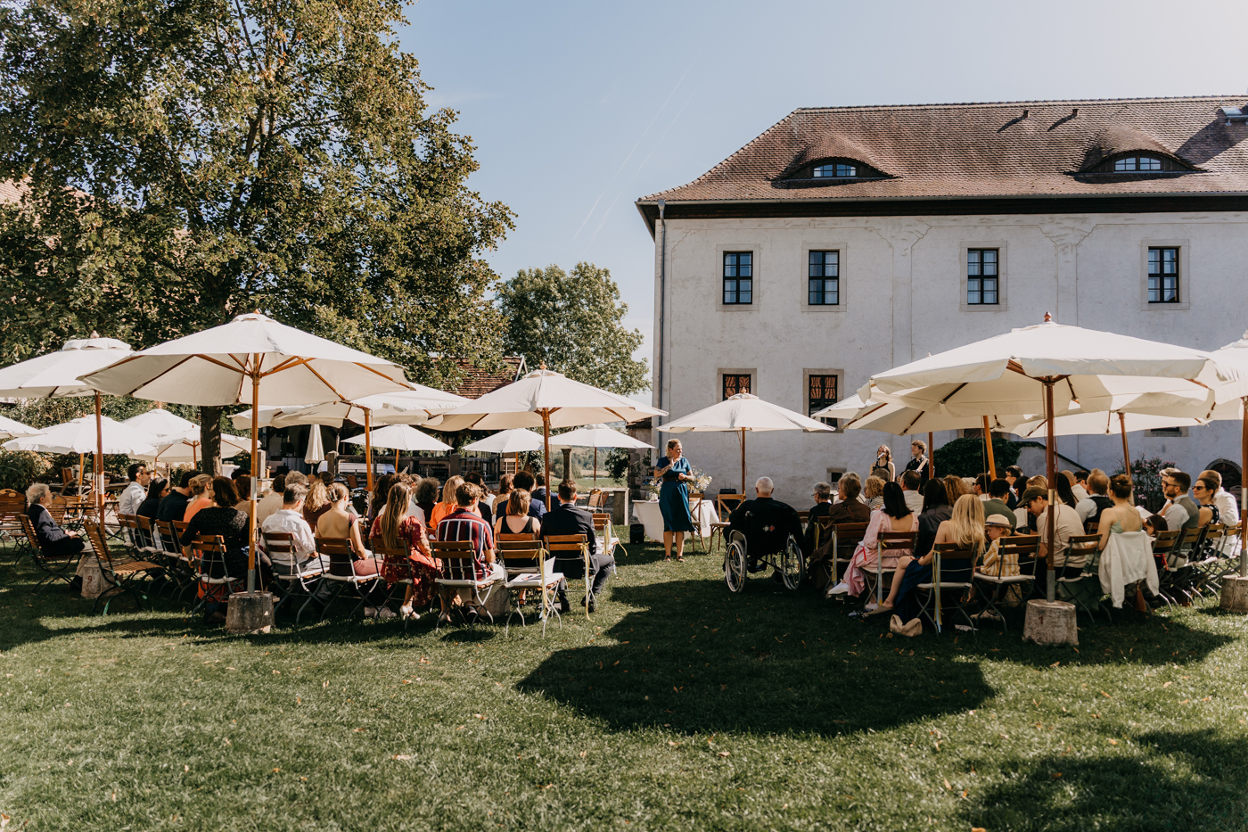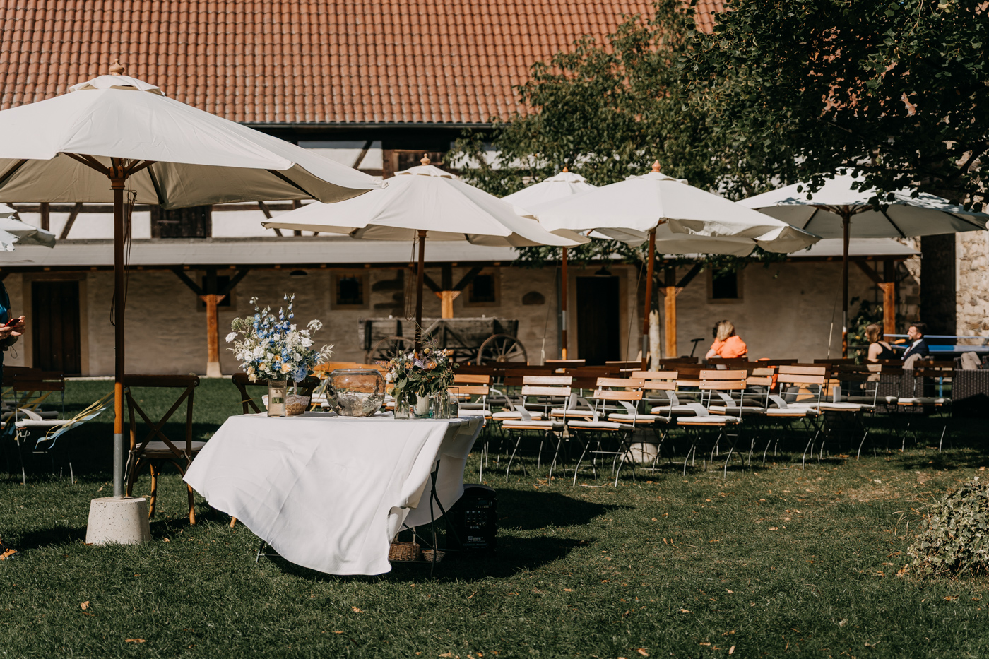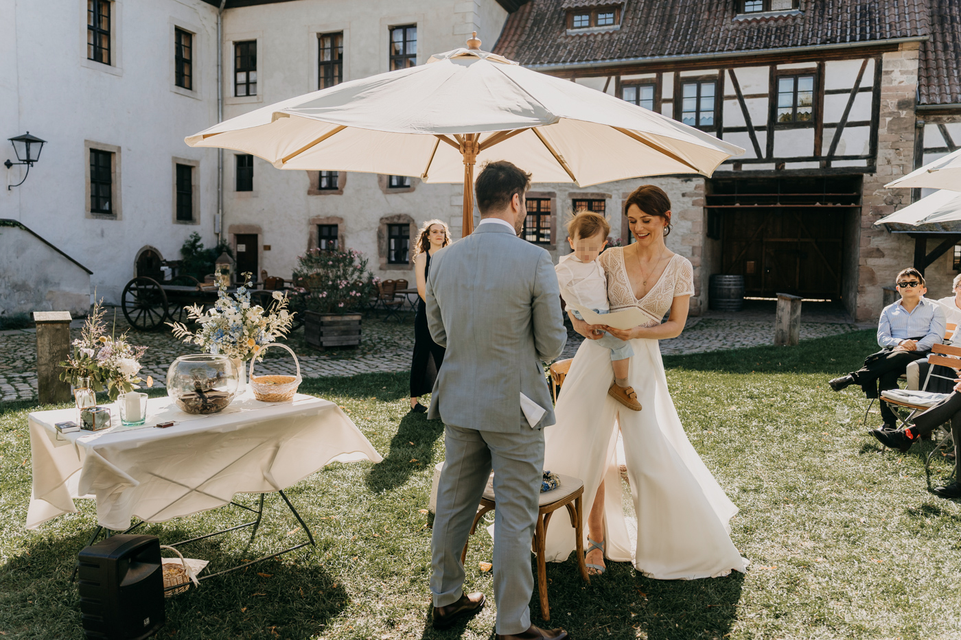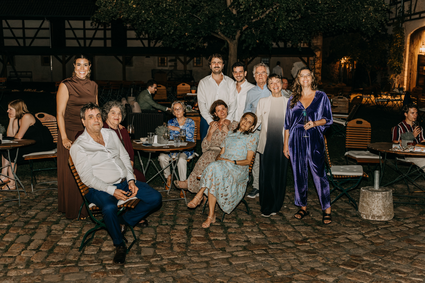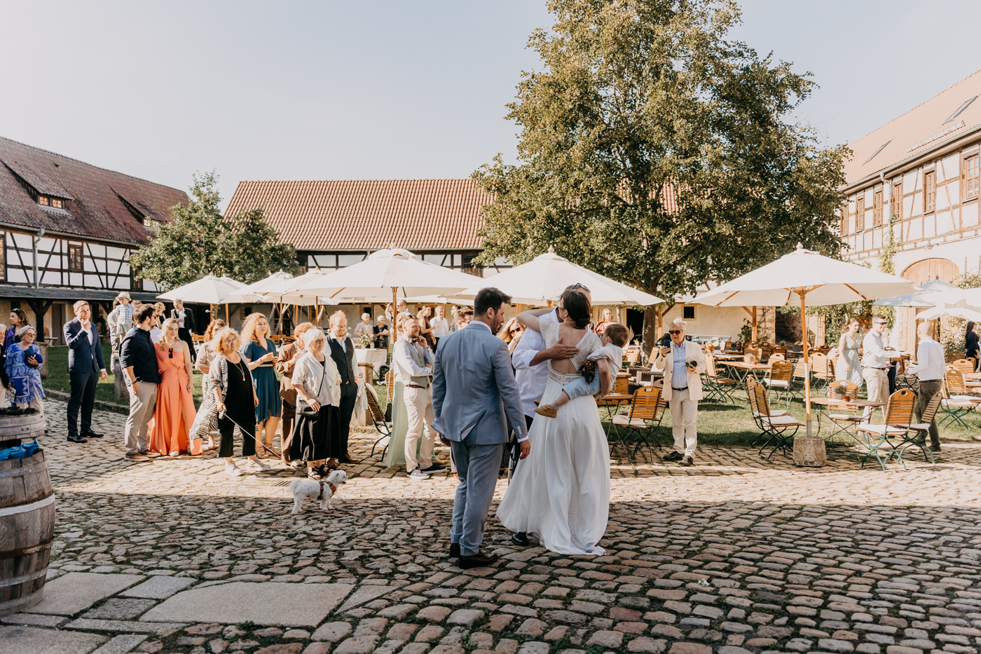 Die freie Trauung im Innenhof des Ritterguts war eines der emotionalen Highlights der Hochzeit. Umgeben von historischen Mauern, spätsommerlichem Grün und ihren liebsten Menschen gaben sich Jule und Gustavo das Ja-Wort. Eine Zeremonie voller persönlicher Worte, ehrlicher Emotionen und ganz viel Lachen – genau so, wie eine freie Trauung sein sollte.