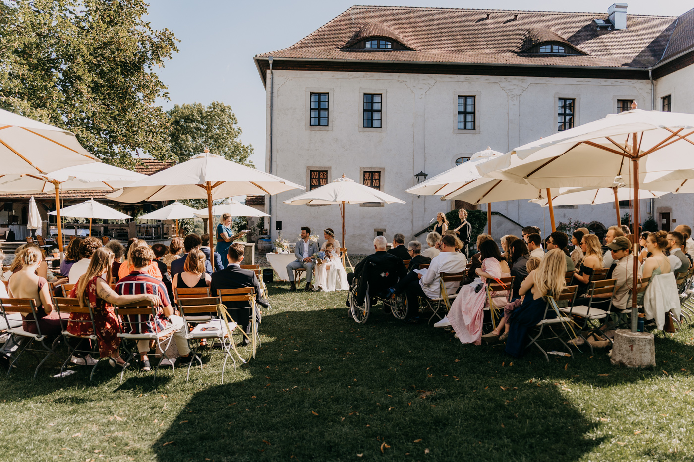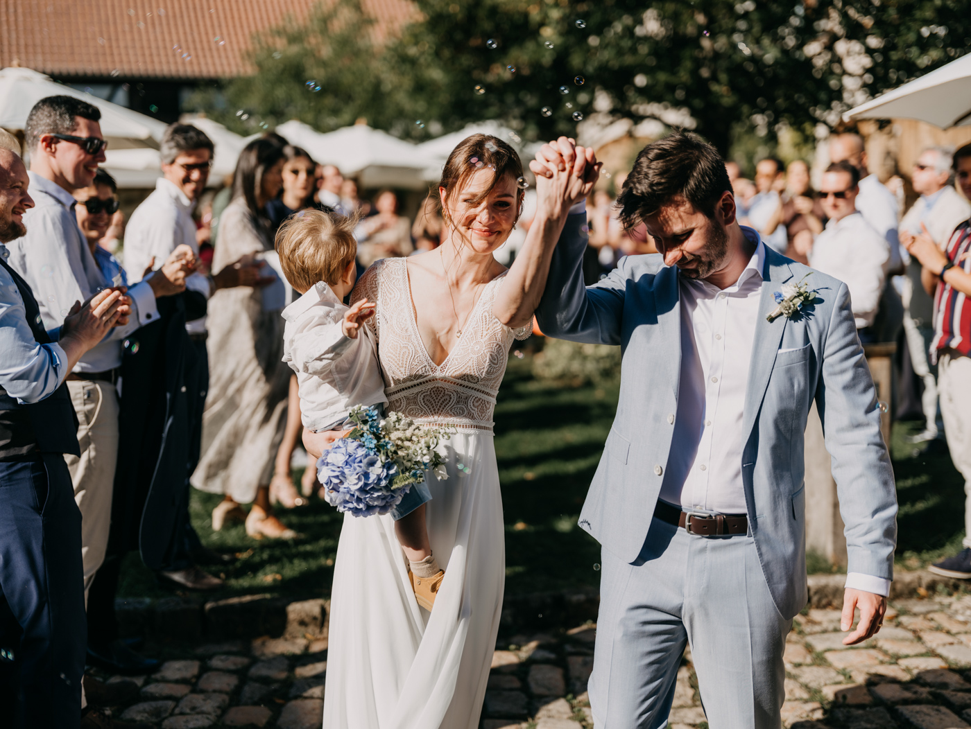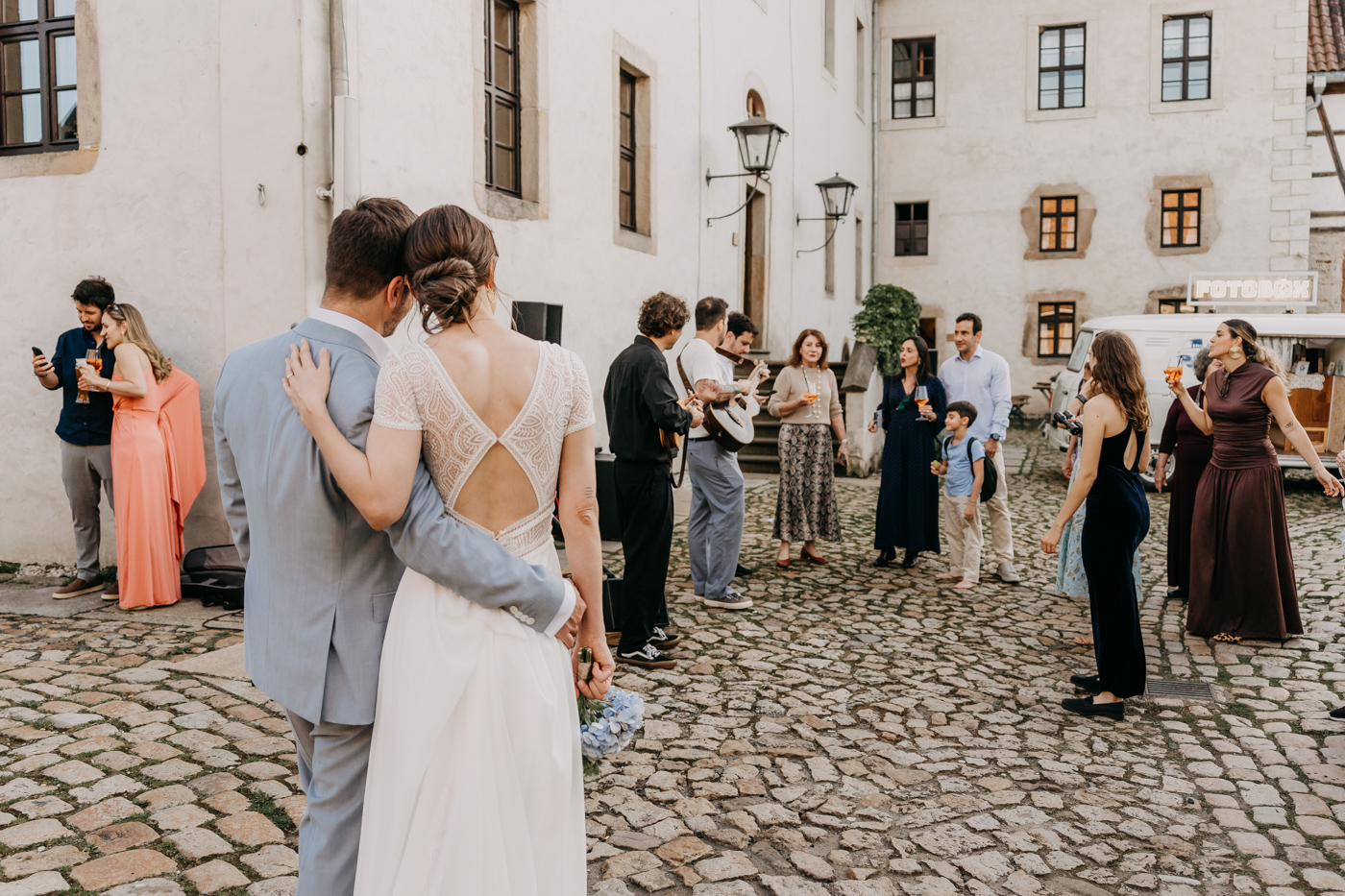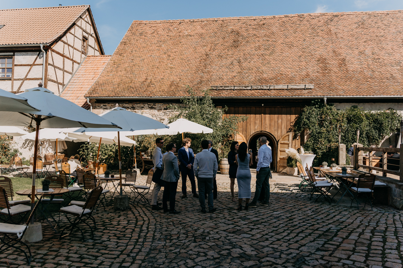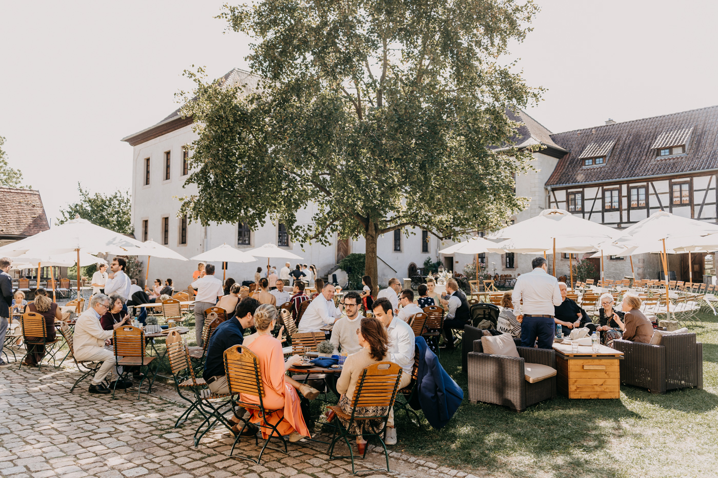 Die freie Trauung im Innenhof des Ritterguts war eines der emotionalen Highlights der Hochzeit. Umgeben von historischen Mauern, spätsommerlichem Grün und ihren liebsten Menschen gaben sich Jule und Gustavo das Ja-Wort. Eine Zeremonie voller persönlicher Worte, ehrlicher Emotionen und ganz viel Lachen – genau so, wie eine freie Trauung sein sollte.