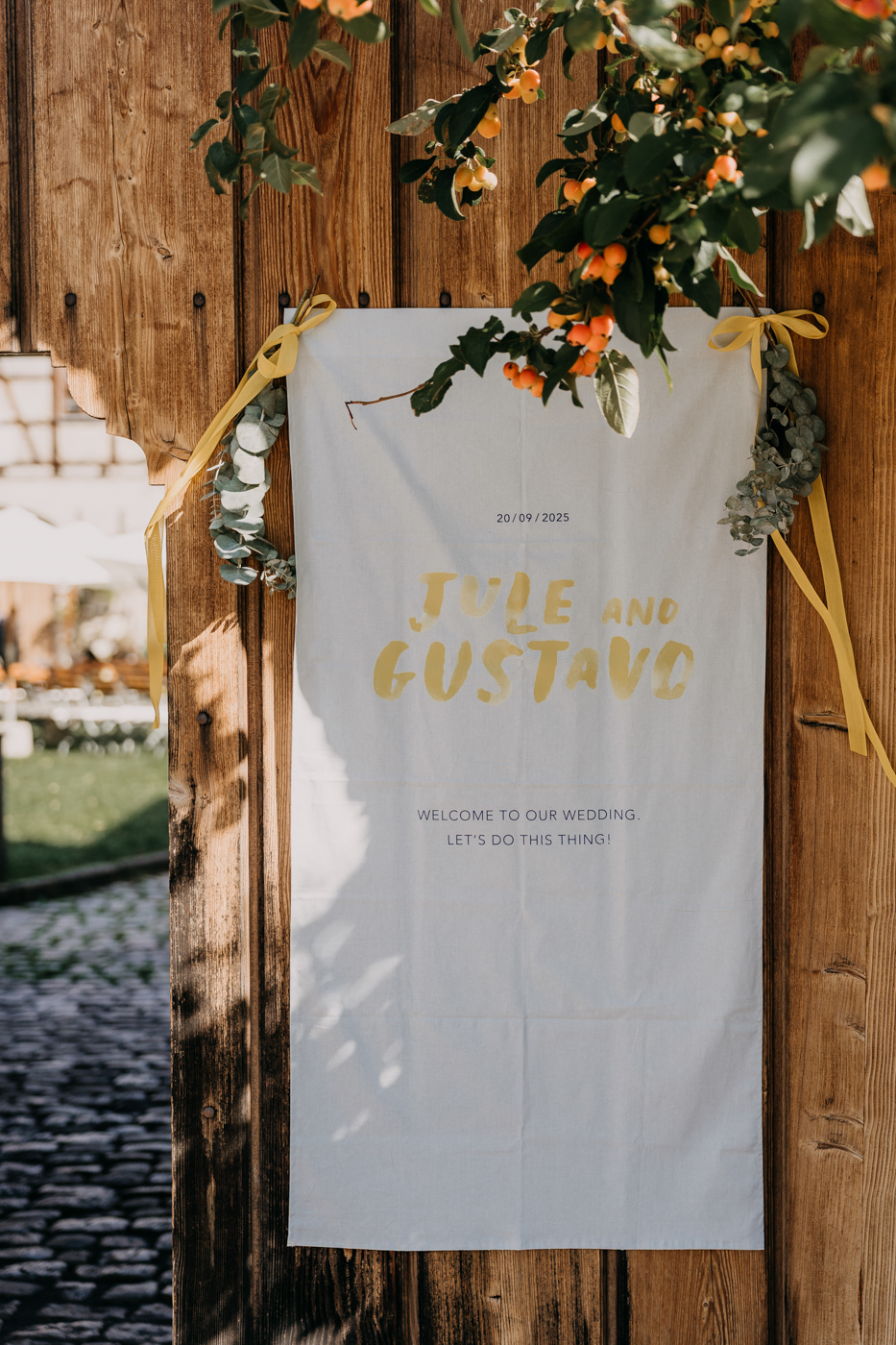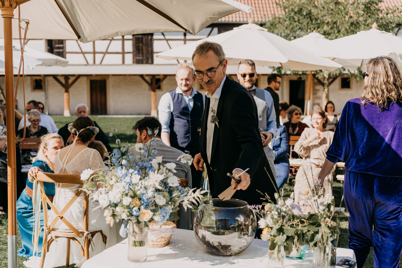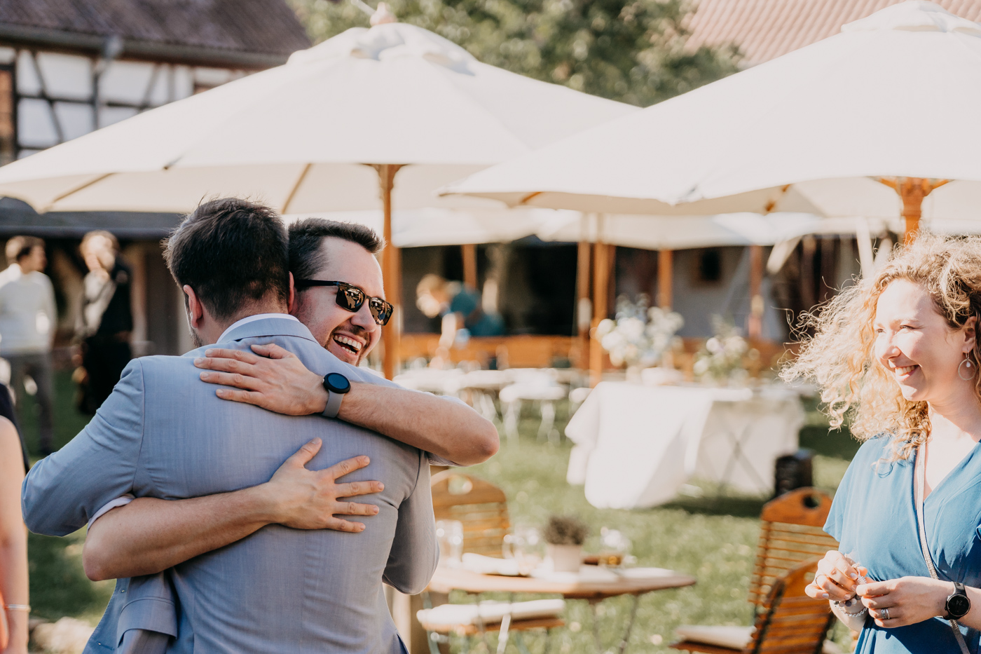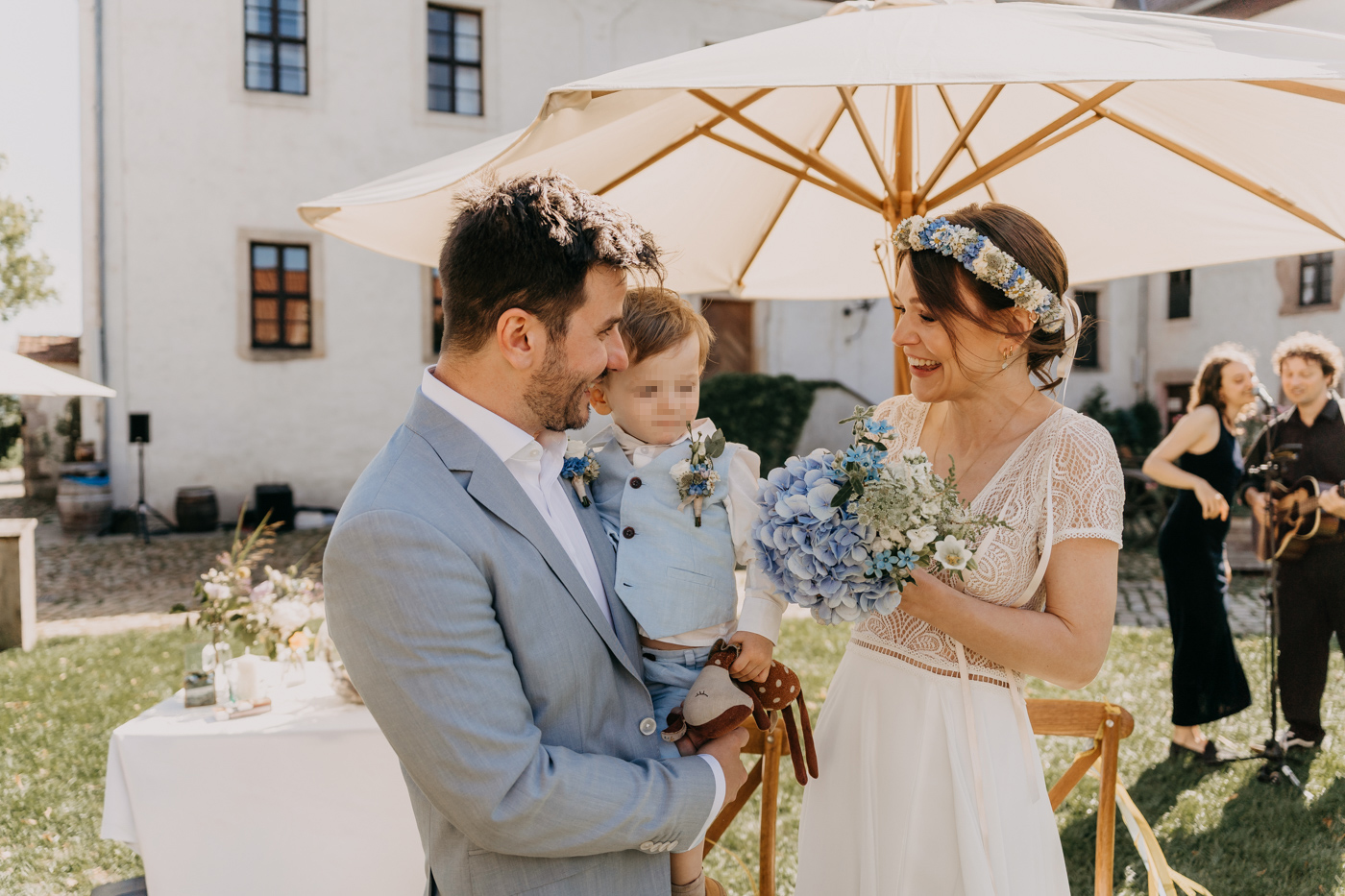 Die freie Trauung im Innenhof des Ritterguts war eines der emotionalen Highlights der Hochzeit. Umgeben von historischen Mauern, spätsommerlichem Grün und ihren liebsten Menschen gaben sich Jule und Gustavo das Ja-Wort. Eine Zeremonie voller persönlicher Worte, ehrlicher Emotionen und ganz viel Lachen – genau so, wie eine freie Trauung sein sollte.
