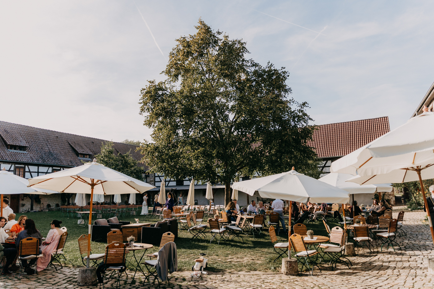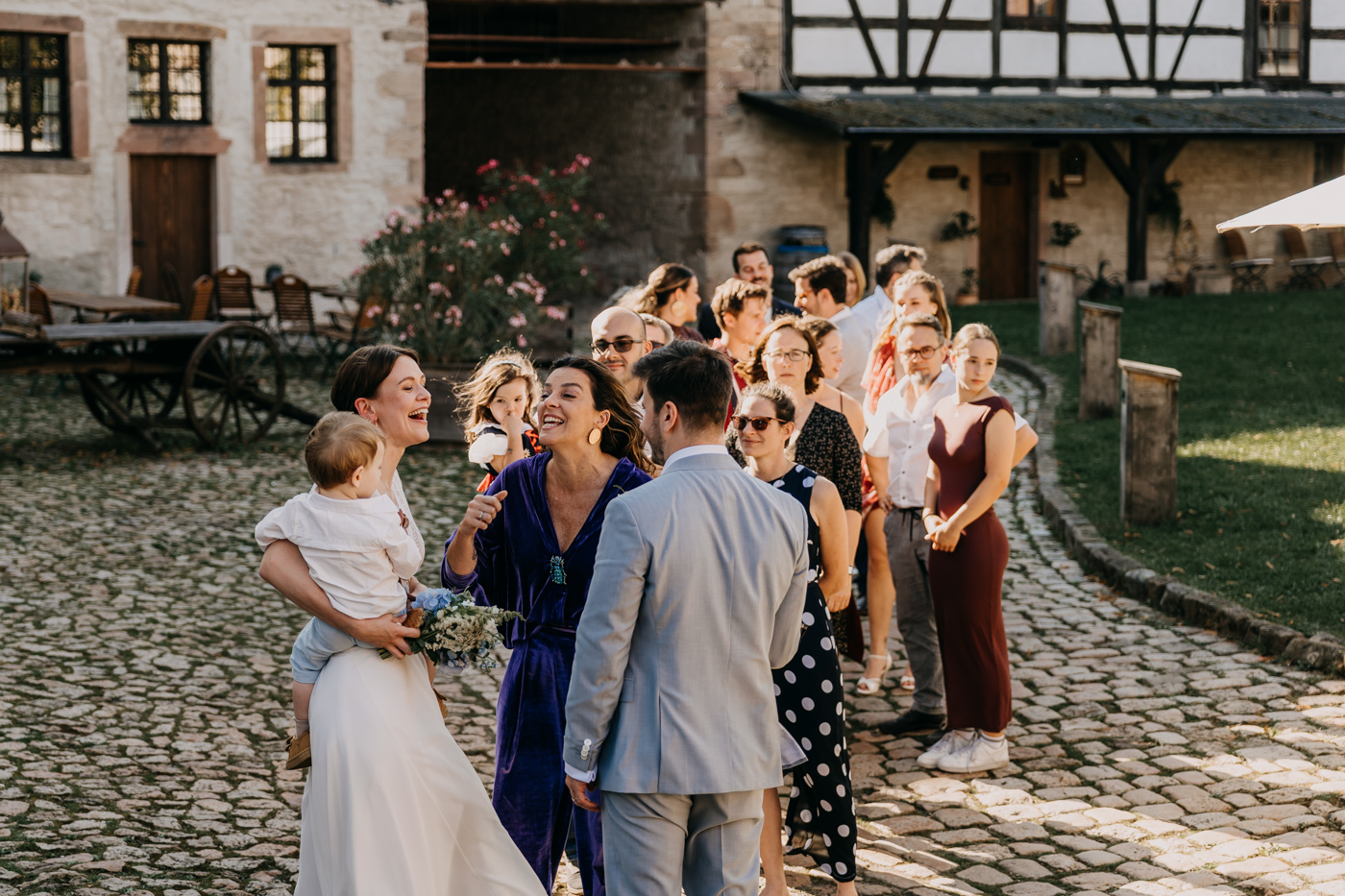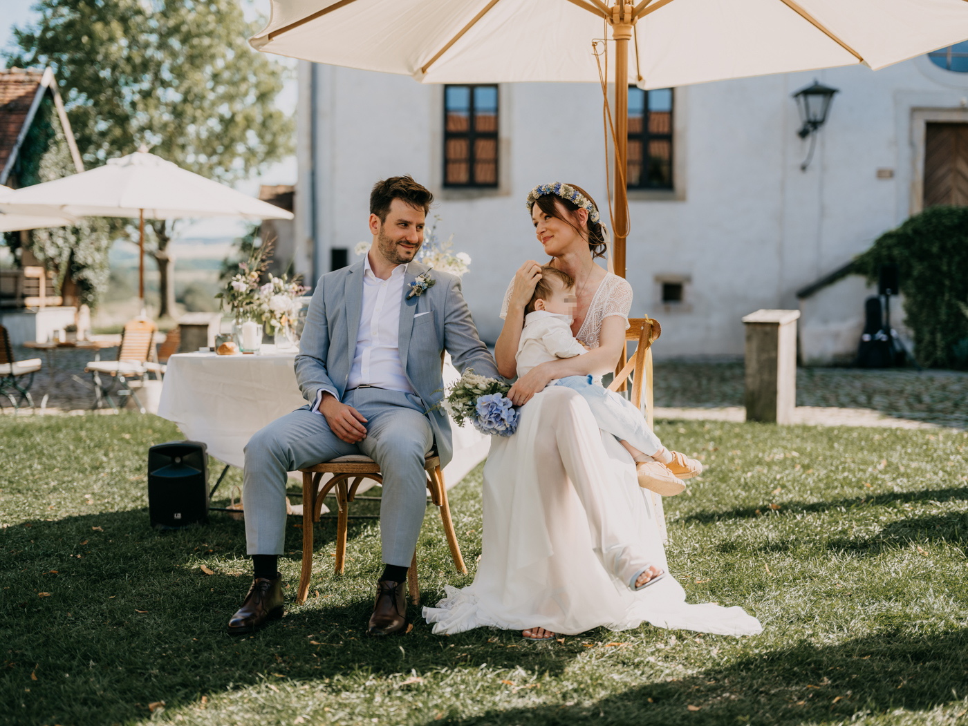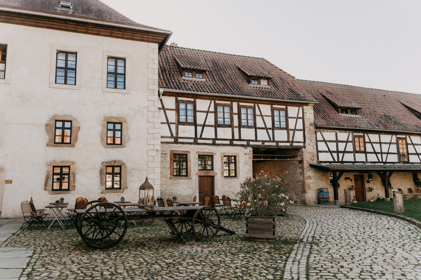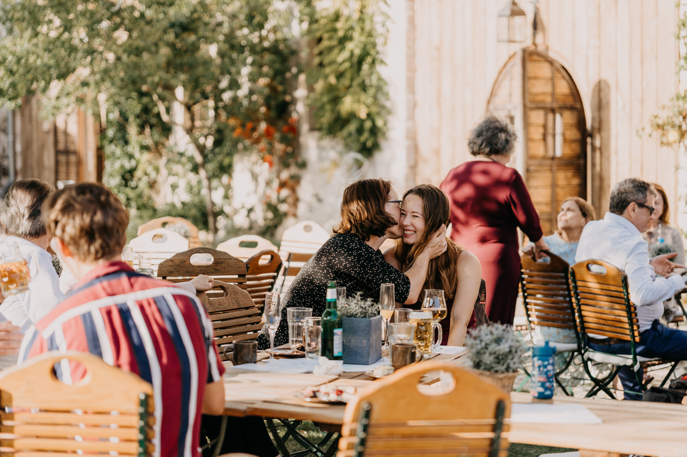 Die freie Trauung im Innenhof des Ritterguts war eines der emotionalen Highlights der Hochzeit. Umgeben von historischen Mauern, spätsommerlichem Grün und ihren liebsten Menschen gaben sich Jule und Gustavo das Ja-Wort. Eine Zeremonie voller persönlicher Worte, ehrlicher Emotionen und ganz viel Lachen – genau so, wie eine freie Trauung sein sollte.