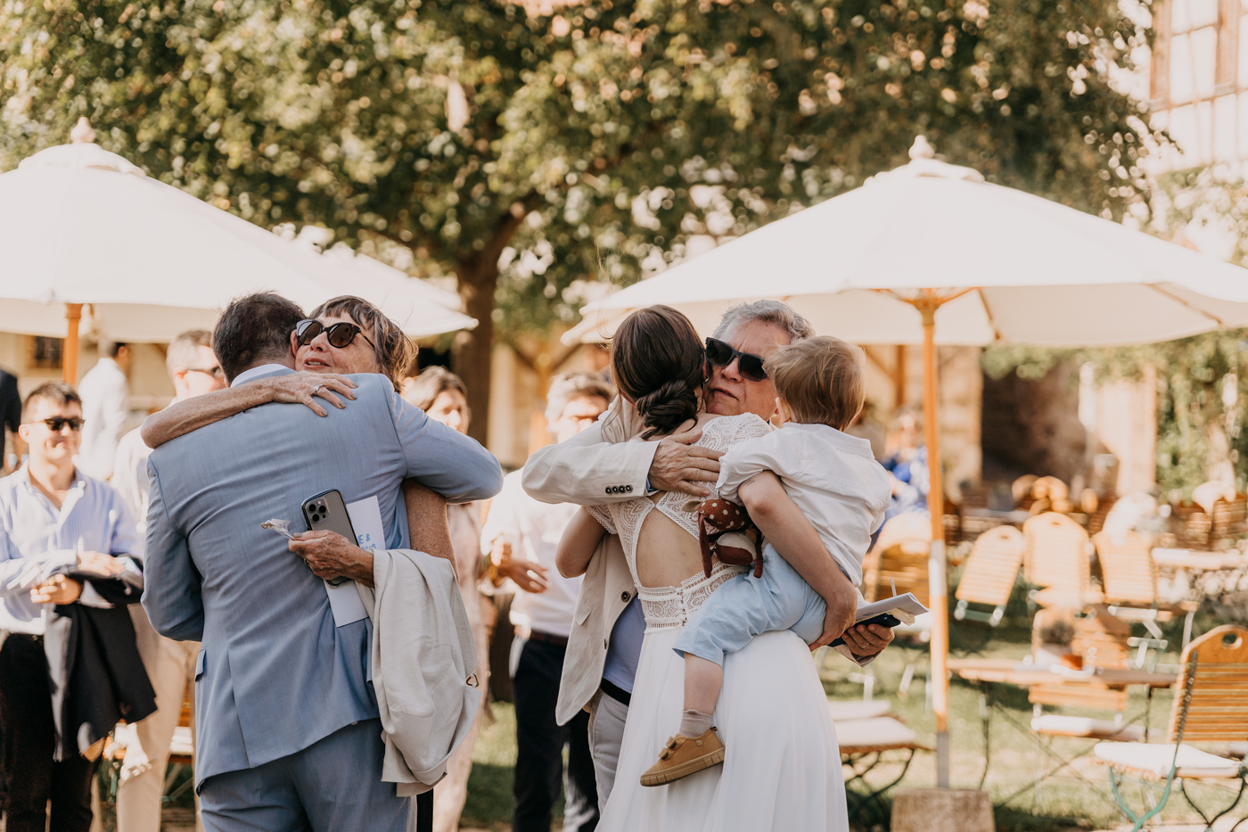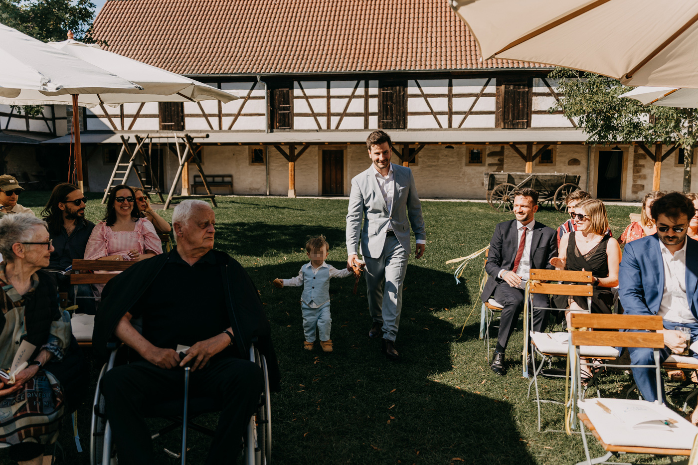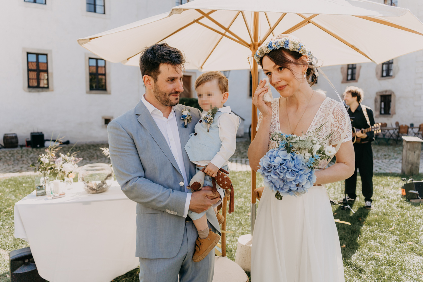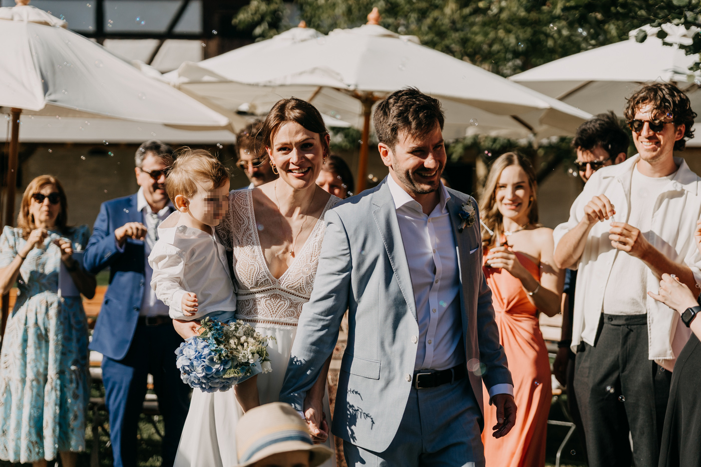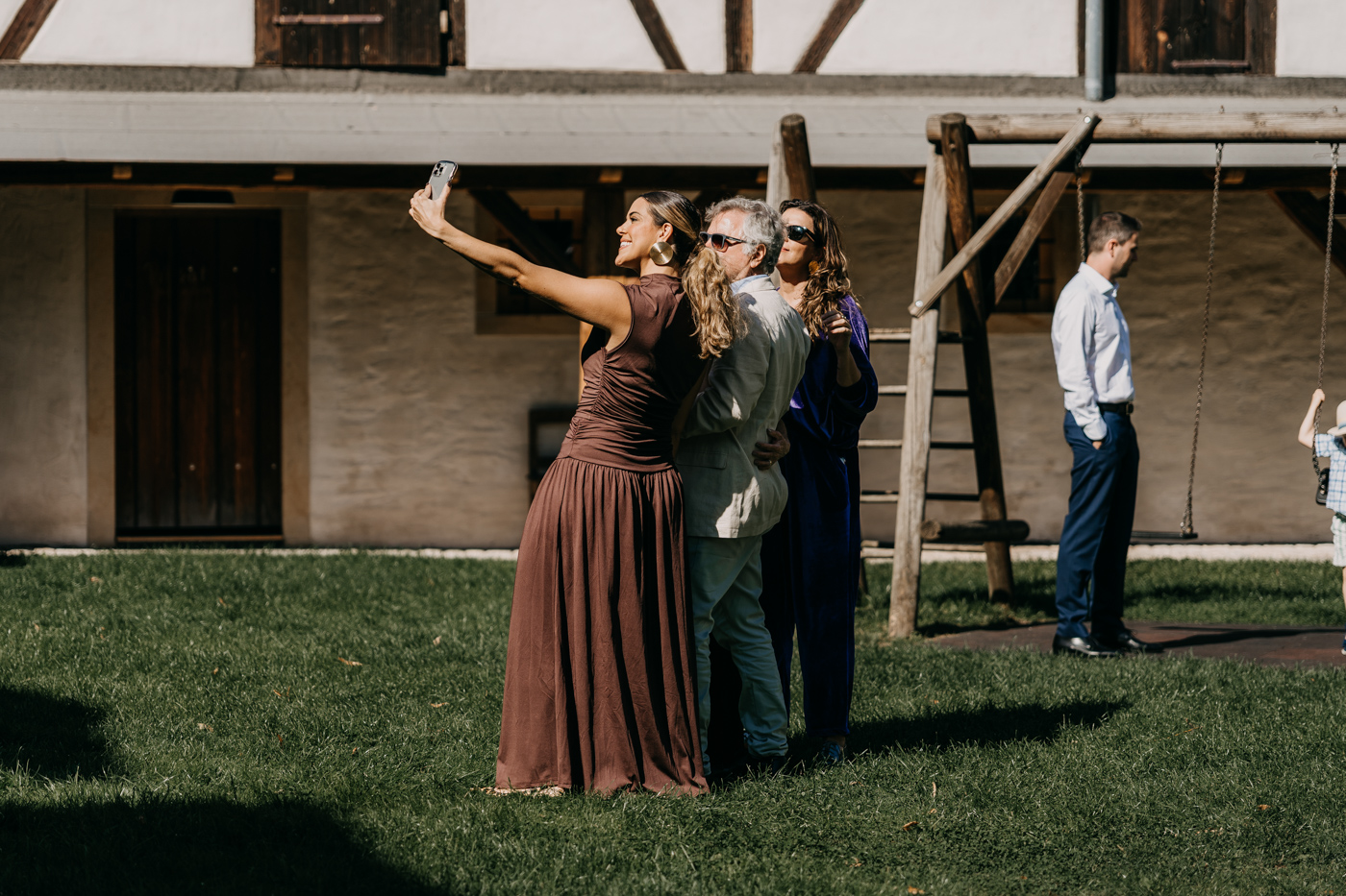 Die freie Trauung im Innenhof des Ritterguts war eines der emotionalen Highlights der Hochzeit. Umgeben von historischen Mauern, spätsommerlichem Grün und ihren liebsten Menschen gaben sich Jule und Gustavo das Ja-Wort. Eine Zeremonie voller persönlicher Worte, ehrlicher Emotionen und ganz viel Lachen – genau so, wie eine freie Trauung sein sollte.