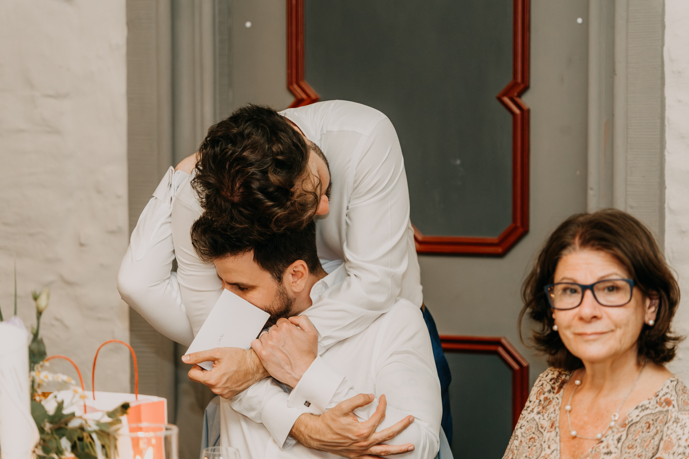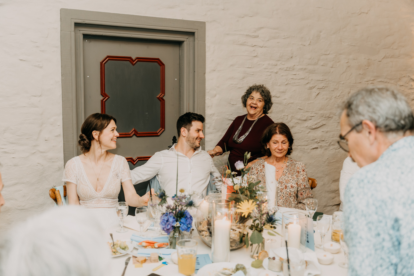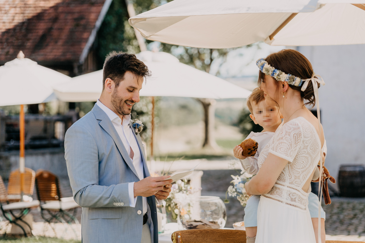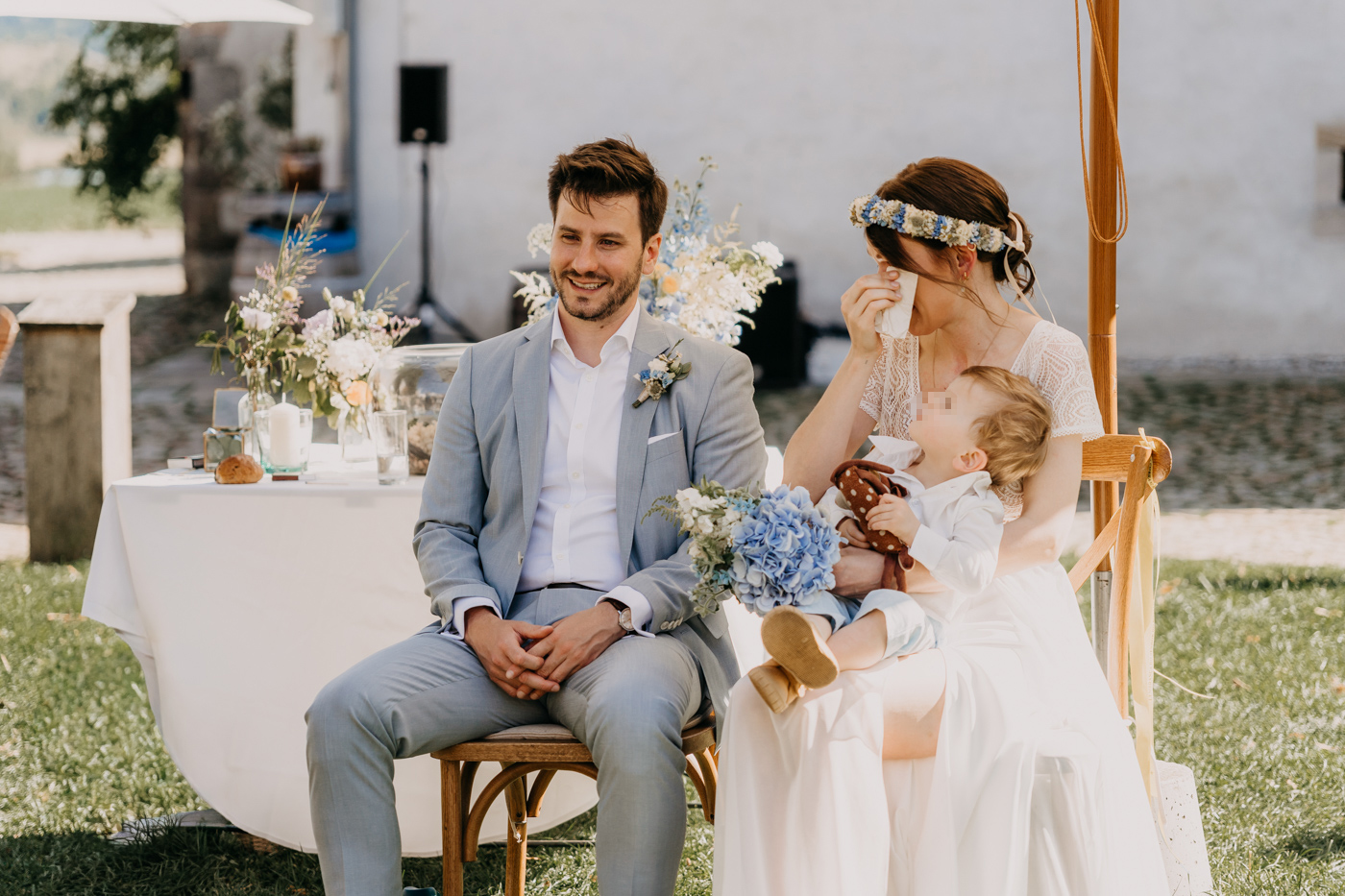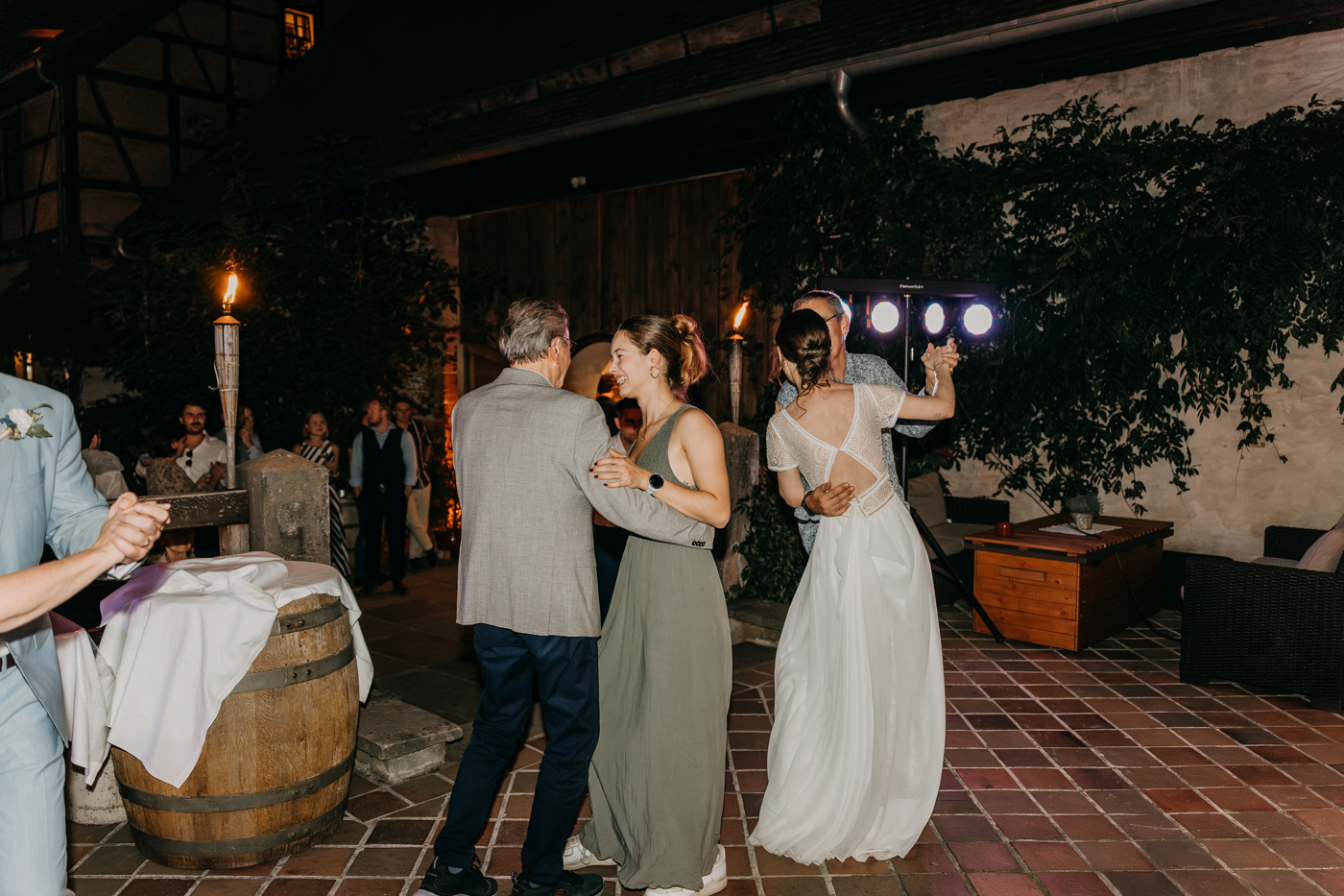 Die freie Trauung im Innenhof des Ritterguts war eines der emotionalen Highlights der Hochzeit. Umgeben von historischen Mauern, spätsommerlichem Grün und ihren liebsten Menschen gaben sich Jule und Gustavo das Ja-Wort. Eine Zeremonie voller persönlicher Worte, ehrlicher Emotionen und ganz viel Lachen – genau so, wie eine freie Trauung sein sollte.